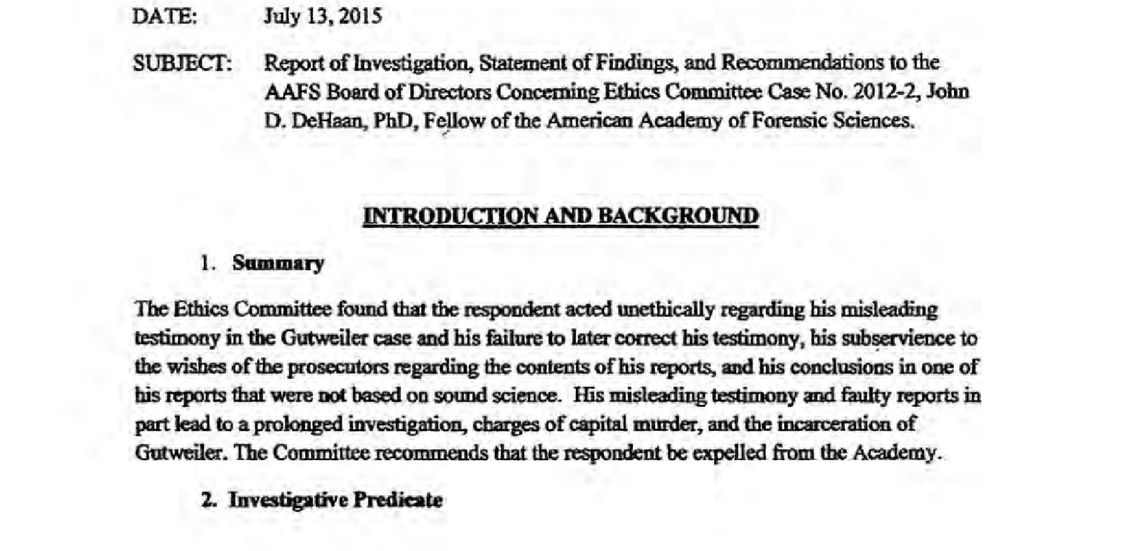 After reviewing his actions related to the Gutweiler case, the Ethics Committee of the American Academy of Forensic Sciences officially recommended that John DeHaan be expelled from the Academy on July 13, 2015.