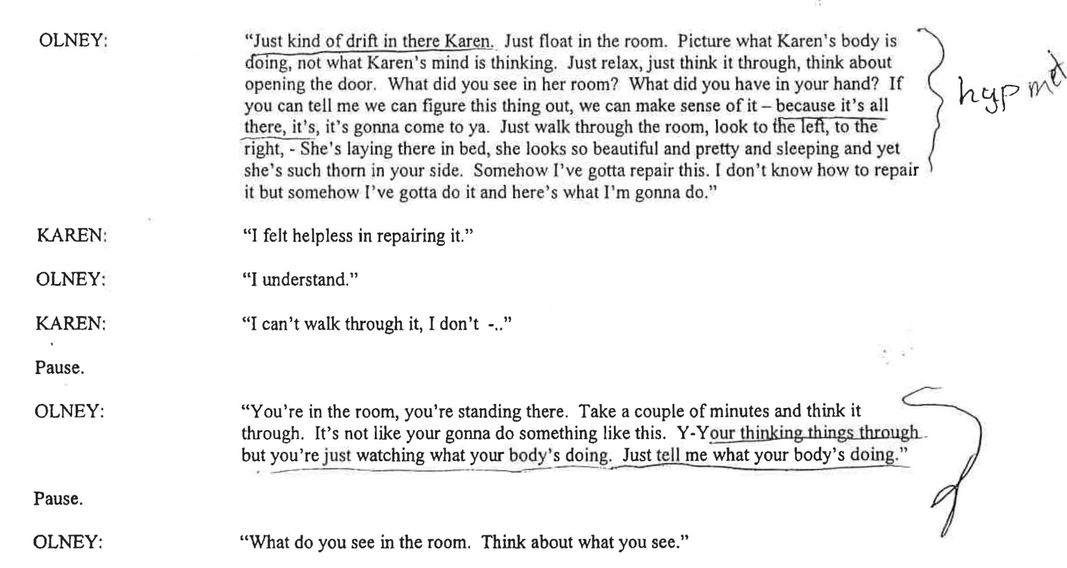 A week after the fire, Karen was tag-team interviewed for 11 ½ hours by Zeeland police, ATF agents, and by her neighbor and friend, Chief Bill Olney. Karen didn't confess to the crime but said she could possibly have done this when not in her right mind or in an unconscious state. The ATF, Michigan State Police, and prosecution expert John Deehan examined the house, but did so months later, and never independently of each other.